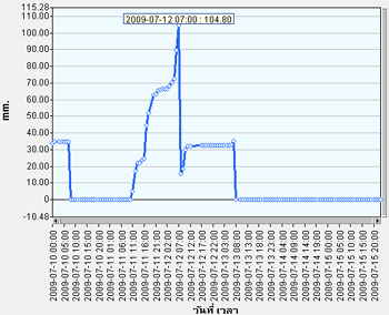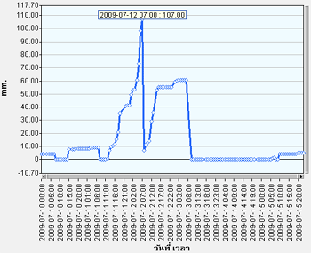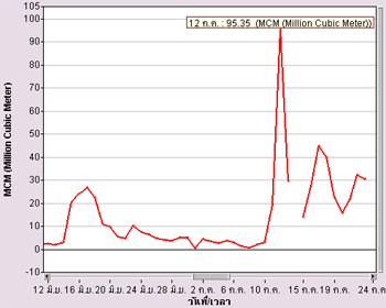จากกราฟแสดงปริมาณไหลลงอ่างเก็บน้ำเขื่อนรัชชประภาของการไฟฟ้าฝ่ายผลิตแห่งประเทศไทย พบว่า การที่มีฝนตกอย่างหนักในหลายจังหวัดบริเวณพื้นที่ภาคใต้ ช่วงวันที่ 11-13 กรกฎาคม 2552 ส่งผลให้ปริมาณน้ำไหลลงเขื่อนรัชชประภาเพิ่มมากขึ้น โดยในวันที่ 12 กรกฎาคม มีปริมาณน้ำไหลลงอ่างอยู่ที่ 95.35 ล้าน ลบ.ม. |
