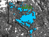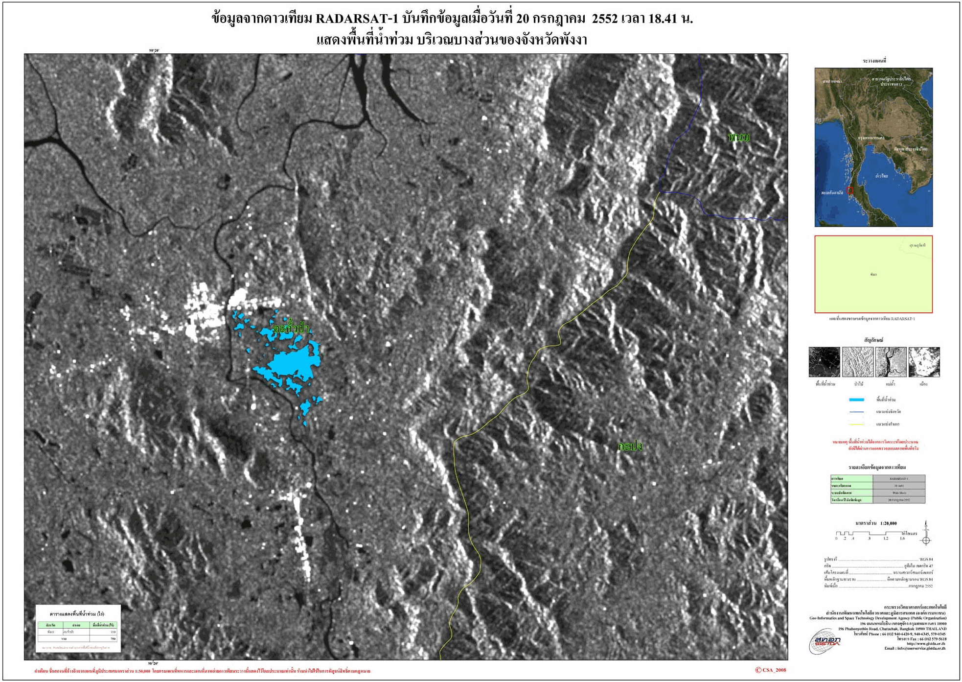 ข้อมูลจากดาวเทียม RADARSAT-1 บันทึกข้อมูลเมื่อวันที่ 20 กรกฎาคม 2552 เวลา 18.41 น. แสดงพื้นที่น้ำท่วมบริเวณบางส่วนของจังหวัดพังงา |