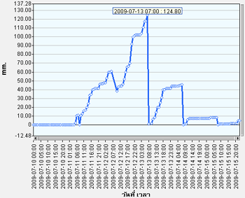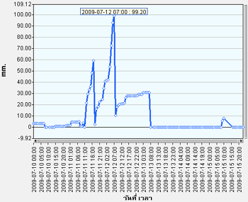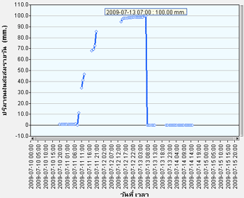 | จากกราฟแสดงข้อมูลปริมาณฝนสะสมที่ตรวจวัดได้จากสถานีโทรมาตรขนาดเล็ก ที่ติดตั้งในพื้นที่จังหวัดตรัง สตูล พังงา และ ระนอง พบว่า ในวันที่ 12 กรกฎาคม มีปริมาณฝนสะสมค่อนข้างมากที่สถานีควนกาหลง จ.สตูล สถานีมะนัง จ.สตูล และ สถานี ปะเหลียน จ.ตรัง โดยมีปริมาณฝนสูงสุด 107.00, 99.20, 104.80 มิลลิเมตร ตามลำดับ ส่วนในวันที่ 13 กรกฎาคม มีปริมาณฝนสะสมค่อนข้างมากที่สถานีหาดส้มแป้น จ.ระนอง และ สถานีทับละมุ จ.พังงา โดยมีปริมาณฝนสะสมสูงสุด 124.80 และ 100.00 มิลลิเมตร ตามลำดับ และจากการเกิดฝนตกหนักในครั้งนี้ ระบบโทรมาตรได้ส่งข้อความเตือนภัยในบริเวณที่มีฝนตกหนักผ่านระบบ sms โดยมีรายละเอียดการเตือนภัยดังนี้