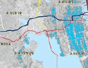 ภาพถ่ายดาวเทียมแสดงพื้นที่น้ำท่วม โดย สำนักงานพัฒนาเทคโนโลยีอวกาศและภูมิสารสนเทศ (GISTDA)