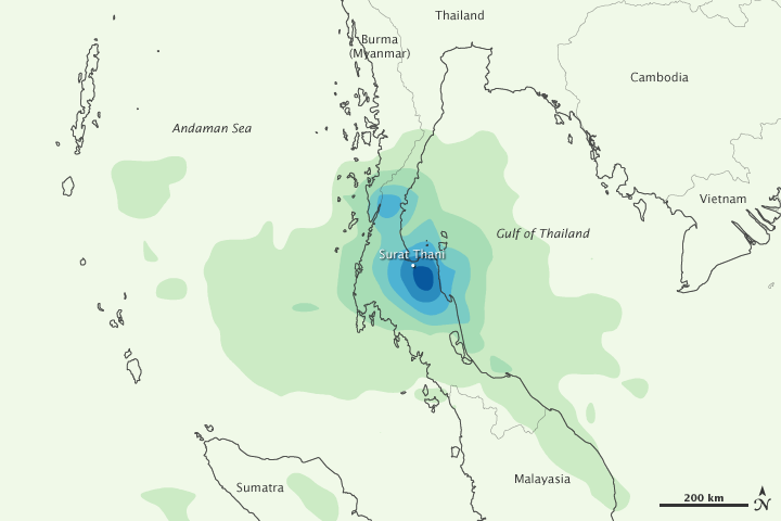 ผู้สื่อข่าวรายงานว่า จากเหตุการณ์มีฝนตกชุกหนาแน่น และมีฝนตกหนักถึงหนักมากในจังหวัดสุราษฎร์ธานี ติดต่อกันหลายวัน เนื่องจากมีความกดอากาศสูงกำลังค่อนข้างแรงจากประเทศจีนแผ่ปกคลุมประเทศ ไทยอย่างต่อเนื่อง ส่งผลให้ลมตะวันออกที่พัดปกคลุมอ่าวไทย และภาคใต้มีกำลังแรง