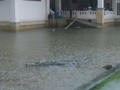 สำหรับจระเข้ที่หลุดออกมาจากสวน สัตว์เทศบาลนครนครศรีธรรมราช มีรายงานว่า ทั้งหมดมีถึง 11 ตัว และได้หลุดออกจากสวนสัตว์จากสภาพน้ำท่วมทั้งหมด โดยเจ้าหน้าที่เทศบาลนครนครศรีธรรมราชได้ระดมกำลังไล่ล่าตลอดทั้ง 24 ช.ม. โดยล่าสุดนั้นได้มีการจับตายไปแล้ว 1 ตัว จับเป็น 2 ตัว และเช้าของวันนี้พบว่ายังว่ายน้ำอยู่ในบริเวณใกล้เคียงสวนสัตว์ 4 ตัว แต่ยังไม่สามารถจับได้ นอกจากนั้นยังมีรายงานการพบเห็นและพบว่าจระเข้จำนวน 3-4 ตัวได้เข้าโจมตีสัตว์เลี้ยงของชาวบ้านที่อพยพหนีน้ำ เป็นแพะ 2 ตัว และเป็ดไก่อีกจำนวนหนึ่ง