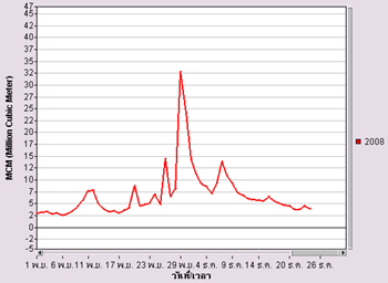 ที่เอ่อล้นตลิ่งอยู่แล้ว มีปริมาณน้ำที่สูงขึ้นจากเดิมอย่างรวดเร็วโดยวัดระดับน้ำกลางแม่น้ำสายหลักทั้ง 3 สายอยู่