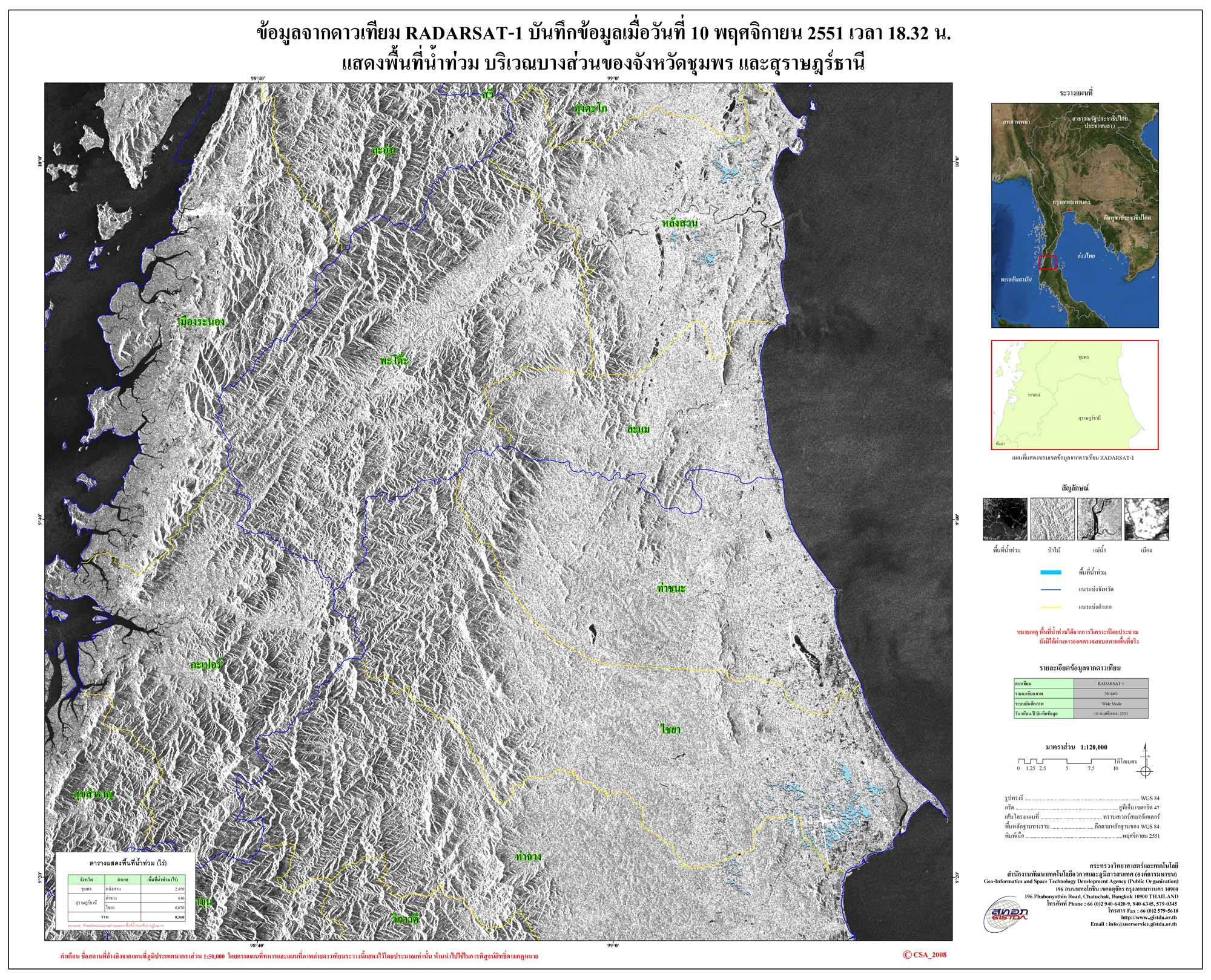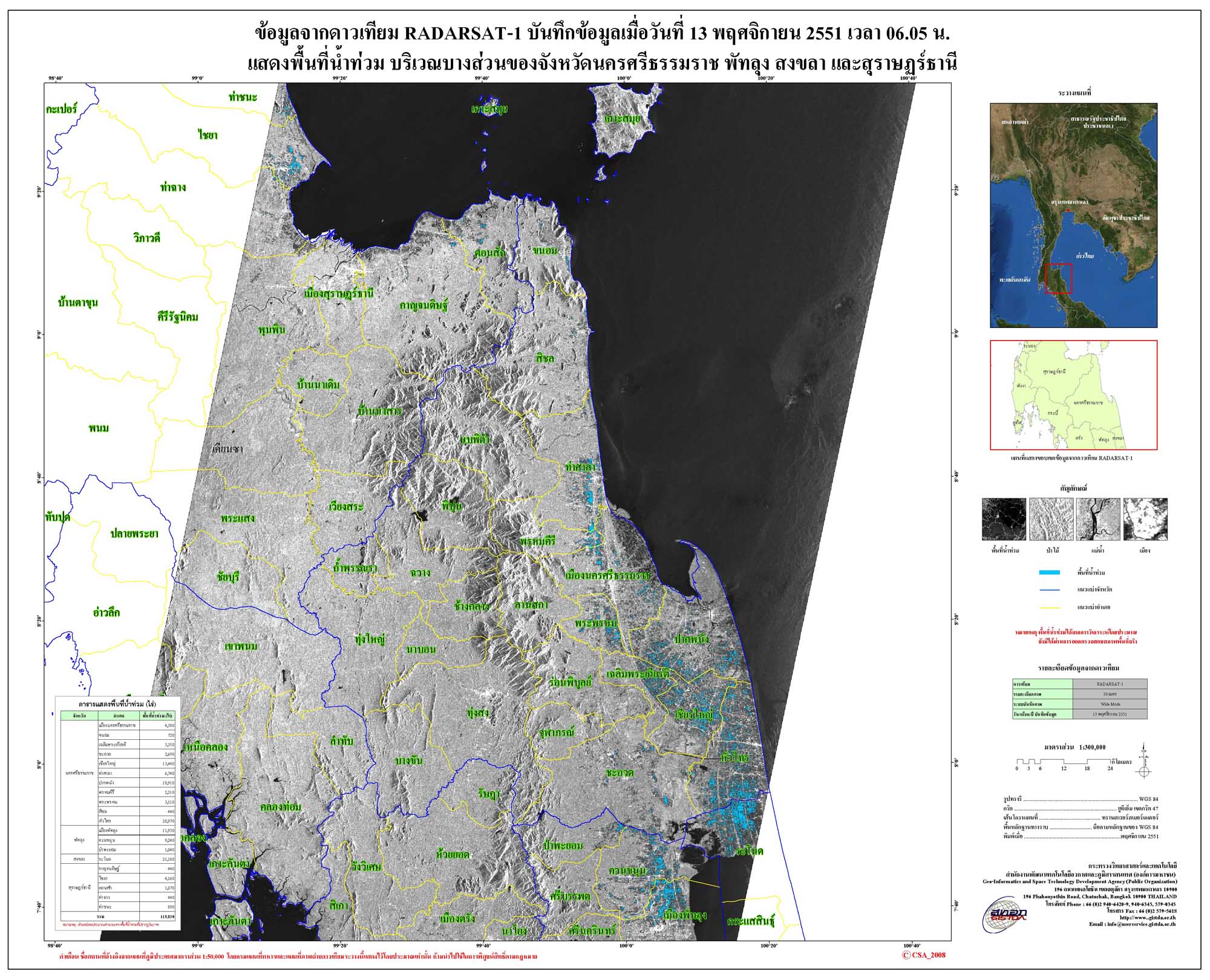 และพบว่าพื้นที่ร้อยละกว่า 70 เปอร์เซ็นต์ ซึ่งเป็นบ้านเรือนของราษฏรและพื้นที่ทางการเกษตรถูกน้ำท่วมขัง จากอิทธิพลของน้ำป่าจากเทือกเขาสันกาลาคีรี ซึ่งมีต้นกำเนิดอยู่ในพื้นที่ อ.สุคิรินได้ไหลทะลักลงมาสมทบกับปริมาณน้ำในแม่น้ำสายหลัก 3 สาย โดยอำเภอที่ราษฏรได้รับความเดือดร้อนที่สุดคือ อำเภอสุไหงโก-ลก