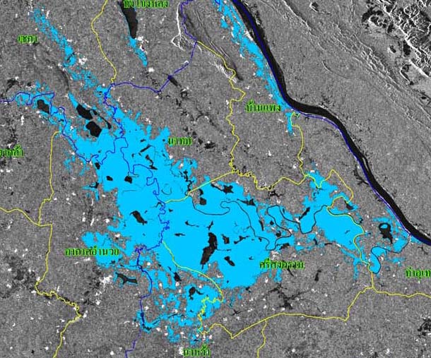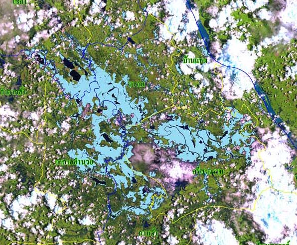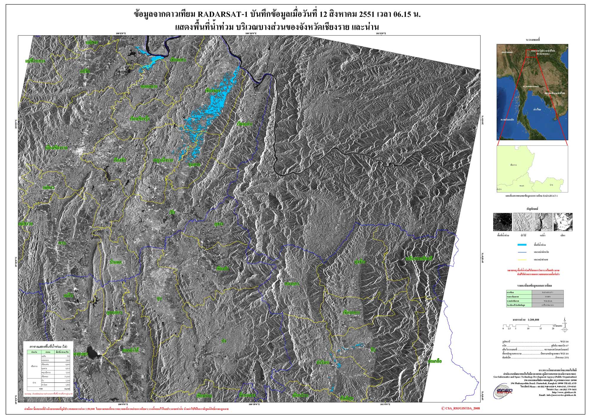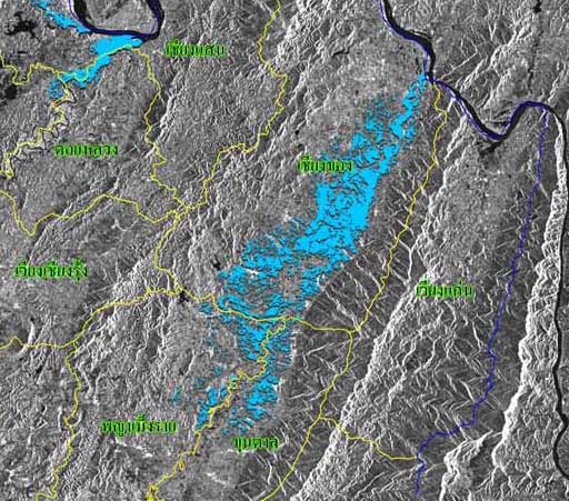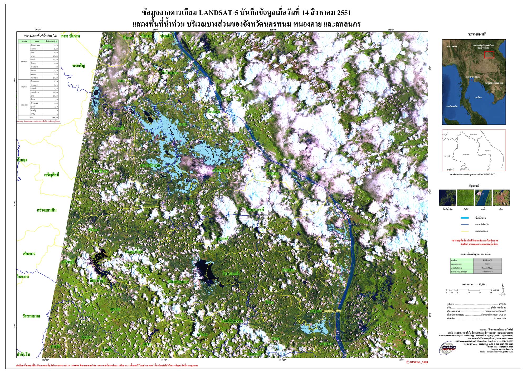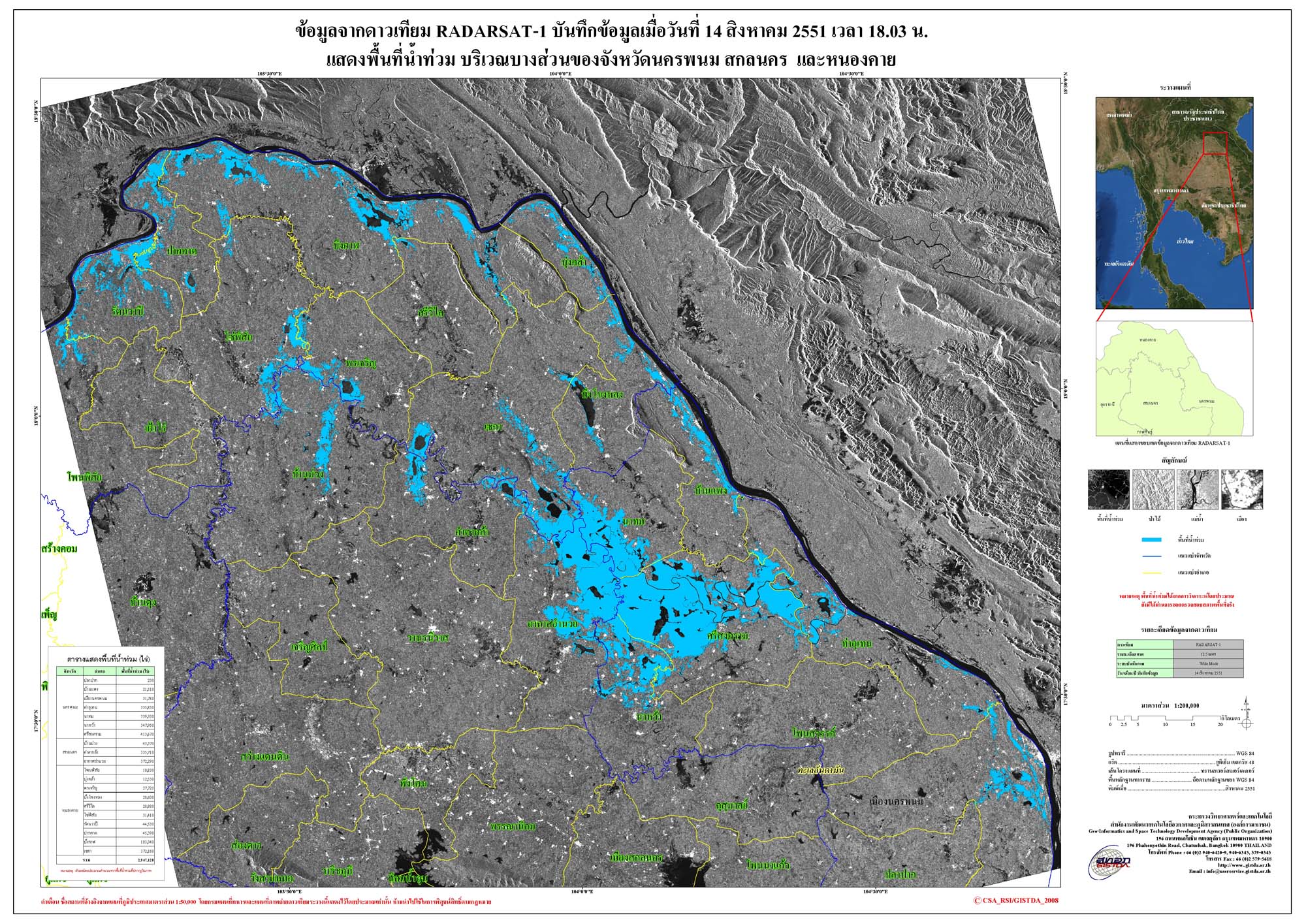 ข้อมูลจากดาวเทียม LANDSAT-5 บันทึกข้อมูลเมื่อวันที่ 14 สิงหาคม 2551 แสดงพื้นที่น้ำท่วมบริเวณบางส่วน ของจังหวัดนครพนม หนองคาย และ สกลนคร | ข้อมูลจากดาวเทียม RADAR-SAT1 บันทึกข้อมูลเมื่อวันที่ 14 สิงหาคม 2551 เวลา 18.03 น. แสดงพื้นที่น้ำท่วมบริเวณบางส่วนของจังหวัดนครพนม สกลนคร และ หนองคาย |