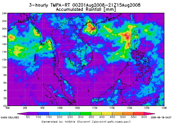 รายงานแผนภาพแสดงปริมาณฝนสะสมจาก NASA ในช่วงวันที่ 1-15 สิงหาคม จะเห็นได้ว่า ในช่วงเวลาดังกล่าวมีกลุ่มฝนเกาะตัวกันเป็นจำนวนมาก