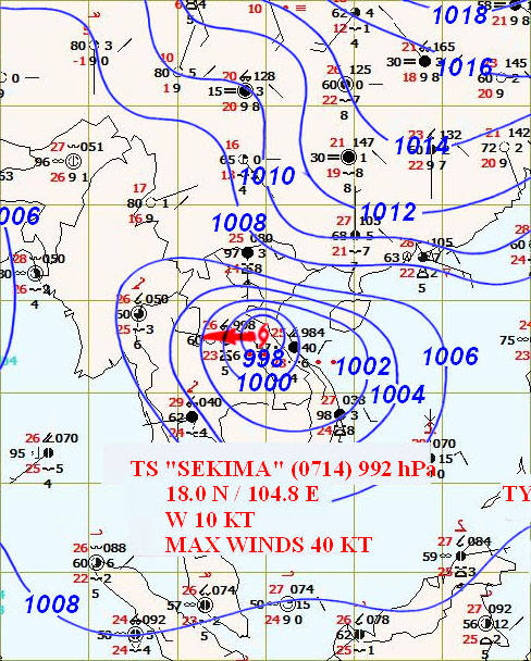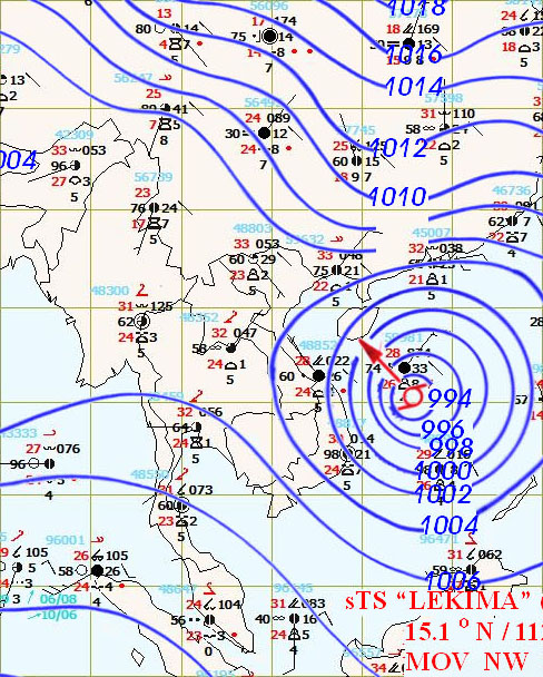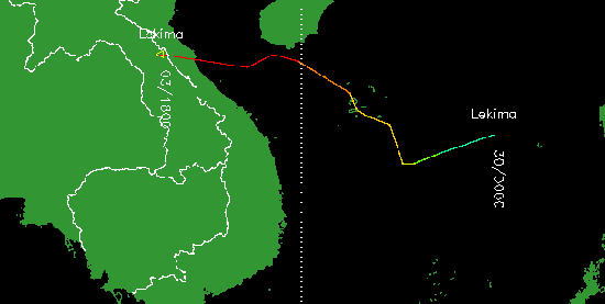 | ในวันที่ 30 ก.ย. 50 พายุเลกิมา ได้ก่อตัวขึ้นที่ทะเลจีนใต้ และเคลื่อนตัวอย่างช้า ๆ ไปทางทิศตะวันตกเข้าสู่ประเทศเวียดนาม และได้อ่อนกำลังลงเป็นพายุโซนร้อนในวันที่ 3 ต.ค. 50 โดย มีศูนย์กลางอยู่ทางตะวันออก ห่างจากจังหวัดนครพนมประมาณ 450 กิโลเมตร หรือที่ ละติจูด 18.0 องศาเหนือ ลองจิจูด 109.0 องศาตะวันออก มีความเร็วลมสูงสุดใกล้ศูนย์กลางประมาณ 100 กิโลเมตรต่อชั่วโมง ทำให้เกิดฝนตกในพื้นที่ภาคตะวันออกเฉียงเหนือด้านตะวันออกบริเวณจังหวัดนครพนม กาฬสินธุ์ มุกดาหาร ร้อยเอ็ด ยโสธร อำนาจเจริญ และอุบลราชธานี หลังจากนั้นได้อ่อนกำลังลงเป็นหย่อมความกดอากาศต่ำและเคลื่อนตัวผ่านภาคตะวันออกเฉียงเหนือและภาคเหนือตอนบนของประเทศไทย ในช่วงวันที่ 4-5 ต.ค. 50 |