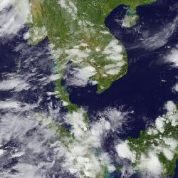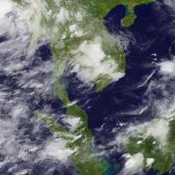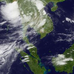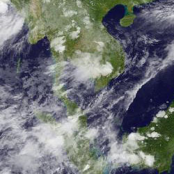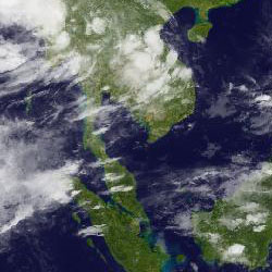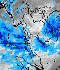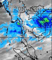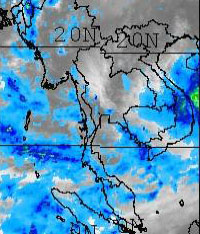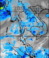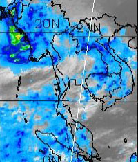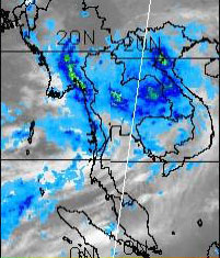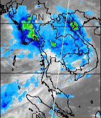 | จากภาพถ่ายดาวเทียม GOES-9 จะเห็นได้ว่ามีกลุ่มเมฆค่อนข้างหนาปกคลุมในหลายพื้นที่ของประเทศ