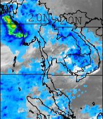 จากภาพบริเวณพื้นที่สีฟ้าและสีเขียวแสดงปริมาณฝนสะสมรายวัน จะเห็นได้ว่า ปริมาณกลุ่มฝนค่อนข้างมากได้เคลื่อนตัวเข้าสู่ประเทศไทยตั้งแต่วันที่