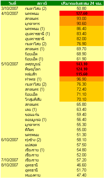 4 ต.ค. ปริมาณฝนสะสมสูงสุดที่สถานีนครพนม โดยมีปริมาณฝน 127.60 มิลลิเมตร และจากตารางแสดงปริมาณฝนสะสมยังพบอีกว่า