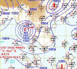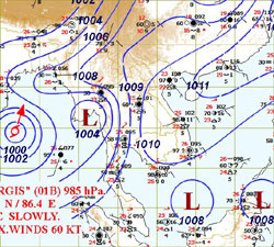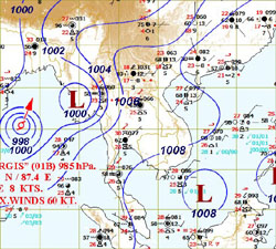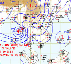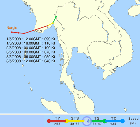 ![]() พายุไซโคลน "นาร์กีส" ( NARGIS) เริ่มต้นจากการเป็นพายุโซนร้อนความเร็วใกล้ศูนย์กลาง ประมาณ 35 นอต หรือประมาณ 65 กิโลเมตร/ชั่วโมง เมื่อวันที่ 28 เมษายน พ.ศ.2551 จากมหาสมุทรอินเดีย และเปลี่ยนเป็นพายุไต้ฝุ่นความเร็วใกล้ศูนย์กลาง ประมาณ 90 นอต หรือประมาณ 167 กิโลเมตร/ชั่วโมง เมื่อวันที่ 1 พฤษภาคม พ.ศ.2551 และเคลื่อนเข้าสู่สหภาพพม่าแถบสามเหลี่ยมปากแม่น้ำอิระวดีรวมทั้งเมืองย่างกุ้ง ด้วยความเร็วใกล้ศูนย์กลาง ประมาณ 110 นอต หรือประมาณ 204 กิโลเมตร/ชั่วโมง ในวันที่ 2 พฤษภาคม พ.ศ.2551 และ พายุลูกนี้ได้ลดความเร็วลงเป็นพายุโซนร้อนในวันที่ 3 พฤษภาคม และกลายเป็นหย่อมความกดอากาศต่ำในวันที่ 4 พฤษภาคม พ.ศ.2551 |
