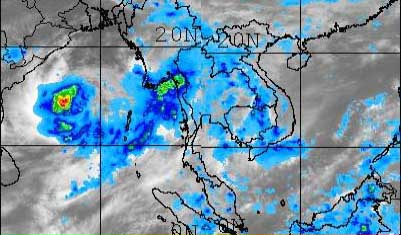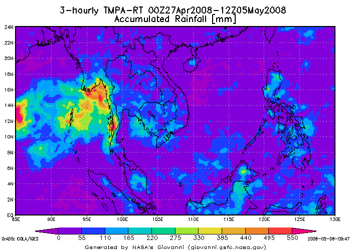 จากแผนภาพแสดงปริมาณฝนสะสมจะพบว่าตั้งแต่วันที่ 22 เม.ย. เริ่มมีกลุ่มฝนเป็นจำนวนมากเคลื่อนตัวเคลื่อนตัวจากบริเวณประเทศอินโดนีเซีย และได้ก่อตัวเป็นพายุโซนร้อนในวันที่ 28 เม.ย. ในบริเวณมหาสมุทรอินเดียและได้เคลือนตัวเ้ัข้าสู่บริเวณอ่าวเบงกอลและขึ้นฝั่งที่ประเทศพม่า หลังจากนั้นได้สลายตัวกลายเป็นหย่อมความกดอากาศต่ำในช่วงวันที่ 4 พ.ค.
