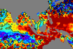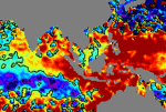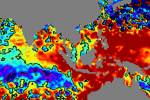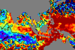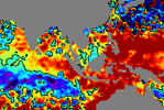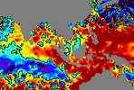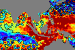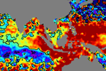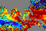 จากแผนภาพแสดงความสูงของคลื่นจากภาพถ่ายดาวเทียม Jason-1 GFO and ENVISATพบว่าตั้งแต่วันที่ 22 เม.ย. ความสูงของคลื่นบริเวณฝั่งอันดามันค่อย ๆ เพิ่มสูงขึ้นเรื่อย ๆ จากระดับปกติ จนเกิน 15 ซ.ม. โดยตั้งแต่วันที่ 28 เม.ย..ความสูงเกินระดับปกติค่อนข้างมาก ได้ขยายบริเวณกว้างอย่างเห็นได้ชัด |
