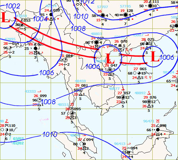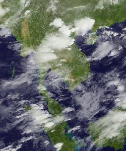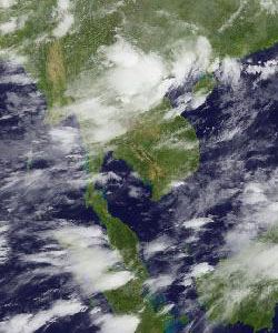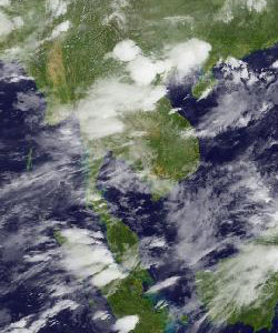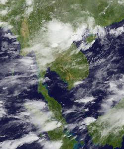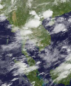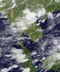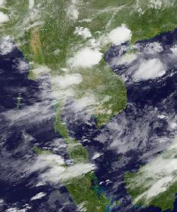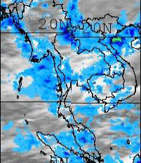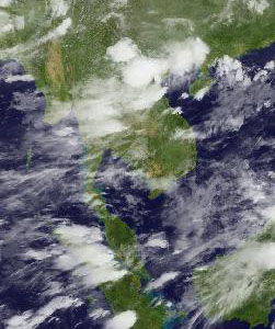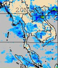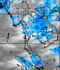 | จากภาพถ่ายดาวเทียม GOES-9 จะเห็นได้ว่ามีกลุ่มเมฆค่อนข้างหนาปกคลุมบริเวณภาคเหนือและภาคตะวันออกเฉียงเหนือ