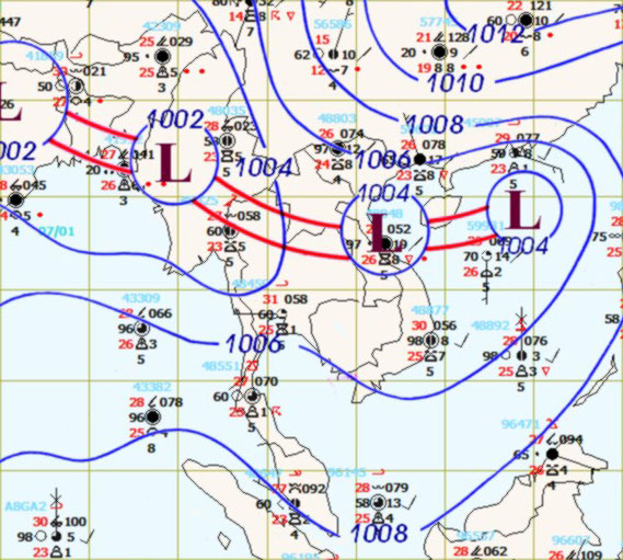 จากภาพแผนที่อากาศจะเห็นได้ว่าในวันที่ 9-10 ก.ย. มีร่องความกดอากาศต่ำพาดผ่านบริเวณภาคเหนือและภาคตะวันออกเฉียงเหนือ