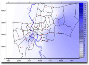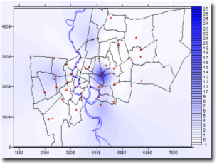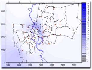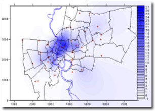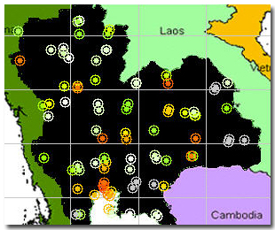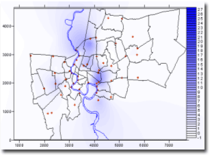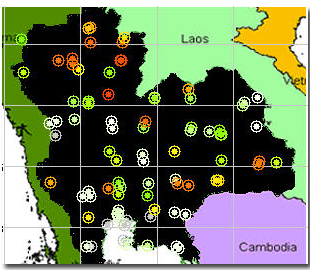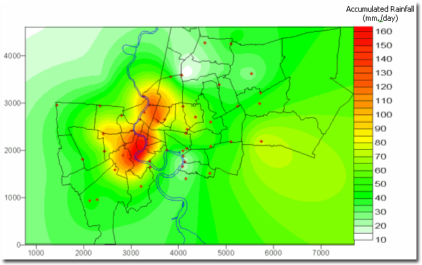 กทม. วันที่ 13 กรกฎาคม 2548 หมายเหตุ ตัวอักษรแสดงข้อมูลปริมาณฝนที่เป็นสีแดง-หนา หมายถึง ปริมาณฝนสะสมรายวันสูงสุดในเขต กทม. และตัวอักษรที่เป็นสีดำ-หนา หมายถึง ปริมาณฝนสะสมรายวันมากกว่า 100 มิลลิเมตรขึ้นไป จากตารางข้อมูลฝนดังกล่าว สามารถนำมาพล็อตรูปเพื่อสังเกตพื้นที่เสี่ยงภัยจากกรณีฝนตกหนักประจำวันได้ดังรูปข้างล่าง |