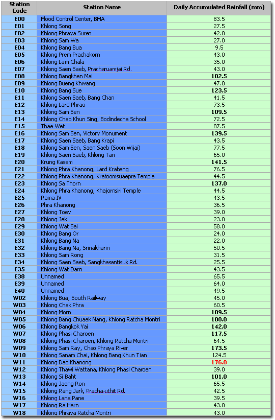 11.5 mm/15 min. Rain at E09 (Khlong Saen Saeb, Bang Chan) = 11 mm/15 min. Rain at W11 (Khlong Dao Kha Nong) = 8.5 mm/15 min. |