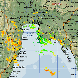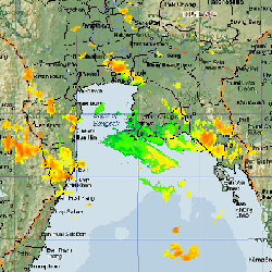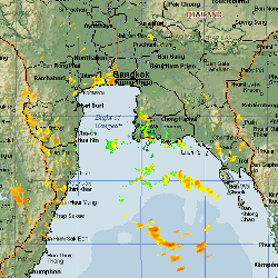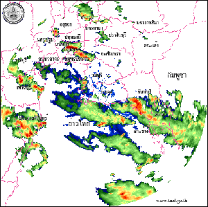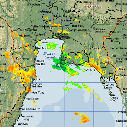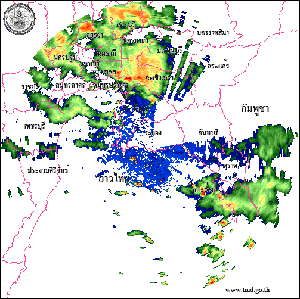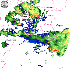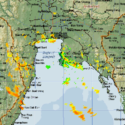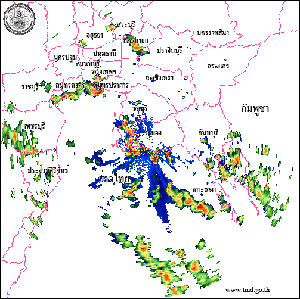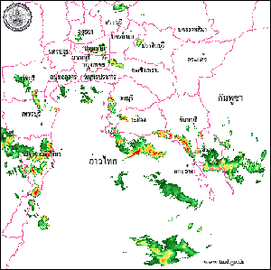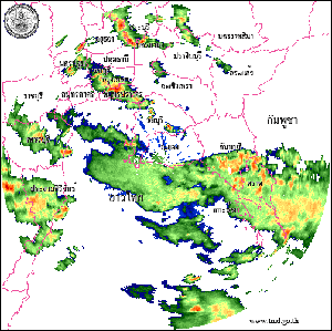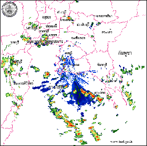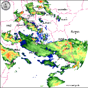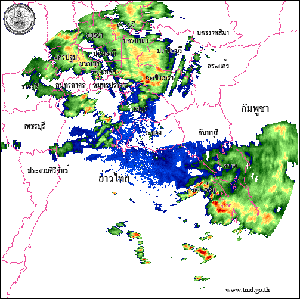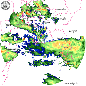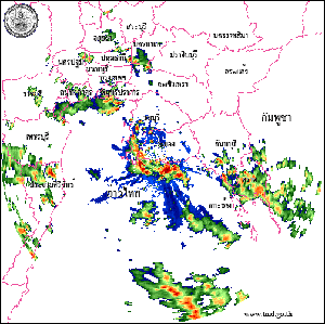 ข้อมูลจากเครือข่ายภาพเรดาร์ของกรมอุตุนิยมวิทยารัศมี 240 กม. ครอบคลุมพื้นที่จังหวัดระยอง จะพบว่ามีฝนตกหนักบริเวณภาคตะวันออก ภาคใต้ตอนบน รวมถึงกรุงเทพมหานครและปริมณฑล |