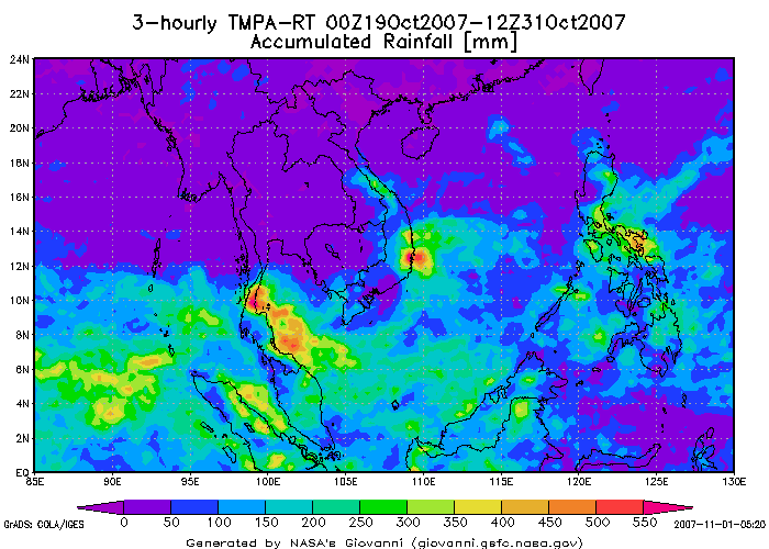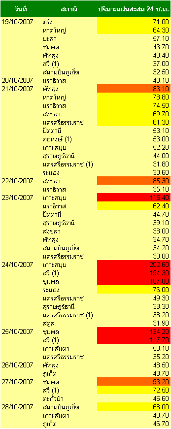 พบว่าตั้งแต่วันที่ 19-28 ตุลาคม 2550 ปริมาณฝนสะสม 24 ชั่วโมง บริเวณภาคใต้