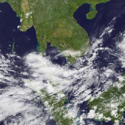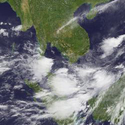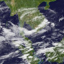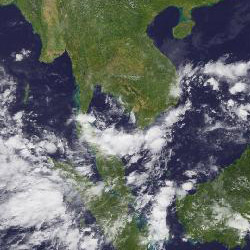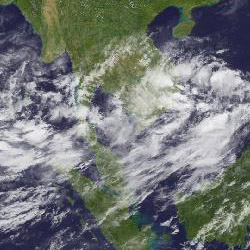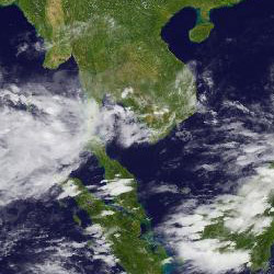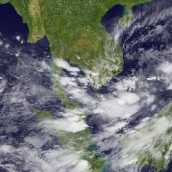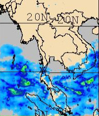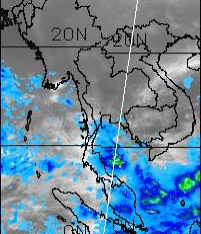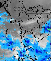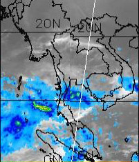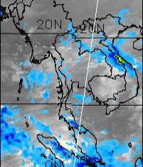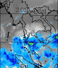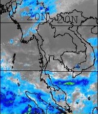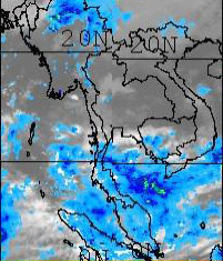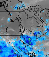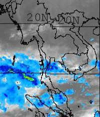 | จากภาพถ่ายดาวเทียม GOES-9 จะเห็นได้ว่ามีกลุ่มเมฆปกคลุมในหลายพื้นที่ของภาคใต้