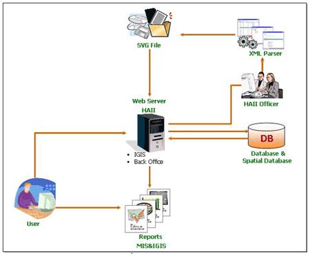 โครงสร้างข้อมูล (Data Model) เชิงพี้นที่ที่จัดเก็บอยู่ในฐานข้อมูลแบ่งได้เป็น 2 ประเภท 1) Raster จะมีลักษณะเป็นตารางสี่เหลี่ยมหรือที่เรียกว่า Grid Cell เรียงต่อกันเป็นแนวแกน X แกน Y ลักษณะการจัดเก็บข้อมูลเชิงพื้นที่ด้วยโครงสร้างแบบ Raster นี้ จะแทนค่าของข้อมูลจากพื้นที่จริงลงในจุดภาพเลย ซึ่งในแต่ละ Grid Cell จะเก็บค่าได้เพียง 1 ค่าเท่านั้น 4. สถาปัตยกรรมระบบ (System Architecture) ![]() ภาพที่ 3 สถาปัตยกรรมระบบ - ข้อมูล GIS แสดงผลตำแหน่ง เส้น ขอบเขตพื้นที่ และรูปภาพ โดยข้อมูลจะถูกแปลงให้อยู่ในรูปแบบของ SVG (ภาษา XML สำหรับการแสดงผลเป็นภาพ) 5. การประมวลผลข้อมูล (Data Processing) เพื่อให้เกิดความเหมาะสมกับการแสดงผลข้อมูลบน Internet GIS ข้อมูลต่างๆ จะถูกประมวลผลก่อนขั้นต้น