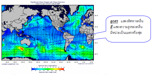 4)แผนภาพความสูงและทิศทางของคลื่นทะเล แสดงความสูงและทิศทางของคลื่นในทะเลบริเวณต่างๆ (ภาพที่ 7) โดยบริเวณใดที่มีกลุ่มคลื่นสูงต่างจากบริเวณใกล้เคียง บริเวณนั้นมักจะมีฝนฟ้าคะนองหรือพายุเกิดขึ้น