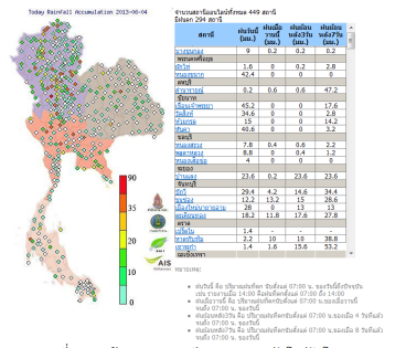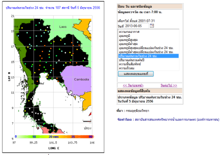 5)ข้อมูลอุตุนิยมวิทยาจากสถานีภาคพื้นดิน ได้แก่ ข้อมูลจากสถานีโทรมาตรตรวจวัดสภาพอากาศอัตโนมัติ ของ สสนก. แสดงข้อมูลปริมาณฝน 24 ชม. และข้อมูลย้อนหลัง (ภาพที่ 7) และข้อมูลจากสถานีตรวจอากาศกรมอุตุนิยมวิทยา แสดงข้อมูลปริมาณฝนอุณหภูมิ ความเข้มแสง ความชื้นสัมพัทธ์ และความเร็วลม (ภาพที่ 8)
