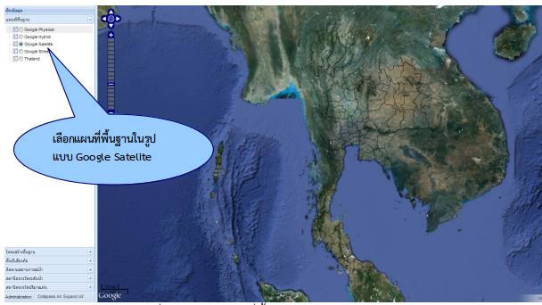 ภาพที่ 11แสดงแผนที่พื้นฐานในรูปแบบ Google Satellite 2) โครงสร้างพื้นฐาน เป็นเมนูที่ใช้แสดงโครงสร้างพื้นฐานของแผนที่ เช่น ถนน ทางน้ำ ทางรถไฟ ลุ่มน้ำ ขอบเขตการปกครอง จากตัวอย่างในภาพที่ 12 เป็นการเลือกข้อมูลทางน้ำ และลุ่มน้ำ