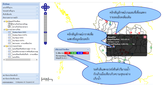 4) ติดตามสถานการณ์น้ำ เป็นเมนูที่ข้อมูลที่ใช้ในการติดตามและวิเคราะห์สถานการณ์น้ำ ประกอบด้วยเมนูย่อย 3 กลุ่ม คือ ข้อมูลน้ำในเขื่อน ภาพถ่ายดาวเทียม และภาพจากแบบจำลอง เมนูข้อมูลน้ำในเขื่อนแสดงตำแหน่งของเขื่อนและปริมาณน้ำในอ่างเก็บน้ำล่าสุด ทั้งจากอ่างเก็บน้ำขนาดใหญ่และอ่างเก็บน้ำขนาดกลาง โดยเป็นข้อมูลจากกรมชลประทานและการไฟฟ้าฝ่ายผลิตแห่งประเทศไทย สามารถคลิกที่สัญลักษณ์บนแผนที่เพื่อแสดงรายละเอียดเพิ่มเติม ตัวอย่างภาพที่ 14 เป็นการคลิกที่สัญลักษณ์ของเขื่อนภูมิพล อ.สามเงา จ.ตาก ที่มีปริมาณน้ำกักเก็บ ณ วันที่ 22 พฤษภาคม 2556 อยู่ที่ 4,902.00 ล้านลูกบาศก์เมตร หรือคิดเป็น 36.41% ของความจุของอ่างเก็บน้ำ ตัวอย่างข้อมูลในกลุ่มภาพถ่ายดาวเทียม ได้แก่ ภาพความชื้นในดินจากหน่วยงาน AFWA ดังแสดงในภาพที่ 15