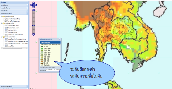 ภาพที่ 15 แสดงค่าความชื้นในดิน จาก AFWA 5) สถานีตรวจวัดระดับน้ำ เป็นเมนูที่ใช้แสดงผลข้อมูลจากสถานีตรวจวัดระดับน้ำในแม่น้ำและเส้นทางน้ำสำคัญของกรมชลประทาน และ สสนก. โดยสถานีตรวจวัดของ สสนก. จะมีทั้งข้อมูลระดับน้ำและข้อมูลด้านภูมิอากาศ (ฝน อุณหภูมิ ความชื้น ความกดอากาศ ความเข้มแสง) จากตัวอย่างในภาพที่ 16 เป็นการเลือกข้อมูลโดยคลิกจากสัญลักษณ์บนแผนที่ของ สถานีน่าน7 ต.งิ้วราย อ.ตะพานหิน จ.พิจิตร ที่มีระดับน้ำ 24.63 ม.รทก. ระดับน้ำอยู่ในสภาวะน้ำน้อย นอกจากนี้สามารถคลิกที่สัญลักษณ์กราฟเพื่อแสดงข้อมูลย้อนหลัง
