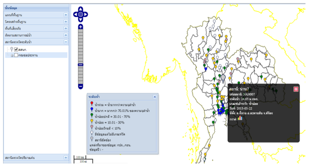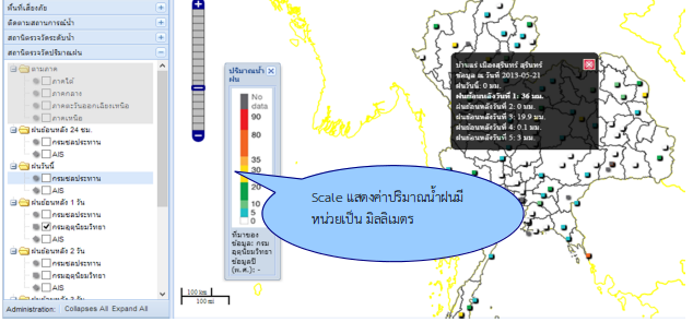 จากตัวอย่างในภาพที่ 17 เป็นการเลือกข้อมูลปริมาณฝนย้อนหลัง 1 วันจากสถานีกรมอุตุนิยมวิทยา โดยผู้ใช้สามารถคลิกที่ไอคอนบนแผนที่เพื่อแสดงรายละเอียดของแต่ละสถานีได้ ตัวอย่างเป็นสถานีสุรินทร์ ณ วันที่ 21 พฤษภาคม 2556 พบว่า ปริมาณฝนย้อนหลัง 1 วัน เท่ากับ 36 มิลลิเมตร